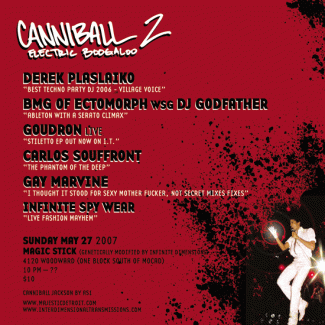 Elements of the party to include NYC's #1 Party DJ Derek Plaslaiko, Goudron (live), BMG of Ectomorph performing with DJ Godfather, Carlos Souffront, Chuck Hampton, and a fashion show from Infinite Dimensions & Spy Wear.