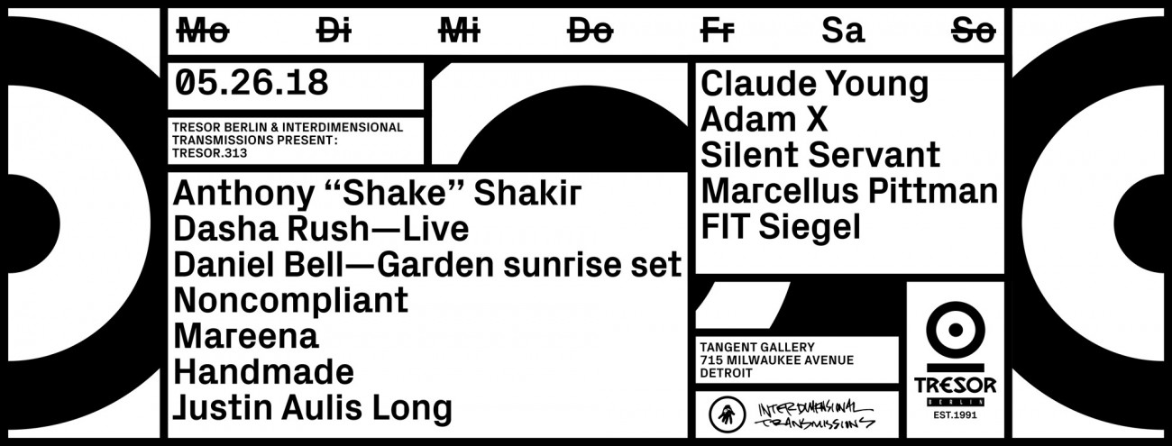 "Tresor uses the bridge it has built over the past three decades, to travel from Berlin to Detroit for its annual visit. For this third collaboration with Interdimensional Transmissions at Tangent Gallery, the Berlin institute calls on some of Motor City's most legendary producers and DJs, as well as some of its closest family members on the North American and European continents.
