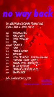 The visuals for this stream have been curated by video artist Andrew Charles Edman. Textures, abstract photos from events and space paintings from Amber Gillen’s private personal collection have been integrated throughout the videos. All processing by ACE within Touch Designer and more, including all the between set interludes that include his own videography from prior No Way Backs, except for Bryan Kasenic’s with visuals by Massive Original, Patrick Russell’s by himself, and Grant Aaron’s by Candace Price. ACE’s approach is deep and subtle, bringing the feelings of No Way Back alive in a normally static medium, and we hope they allow for a deeper connection.