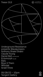 Underground Resistance present Wavejumpers, debuting a brand new show in the Ballroom, presenting the edition of their next record, UR-097 - Wavejumpers. A deep-sea impulse, calling on the intention of whoever dares to listen, to come together and reunite. Responding to the signal is Batu, whose intricate rhythms have become a hallmark sound for his celebrated Timedance label, as well as Interdimensional Transmissions’ Ectomorph and Israel Vines. Musical signatures meet.