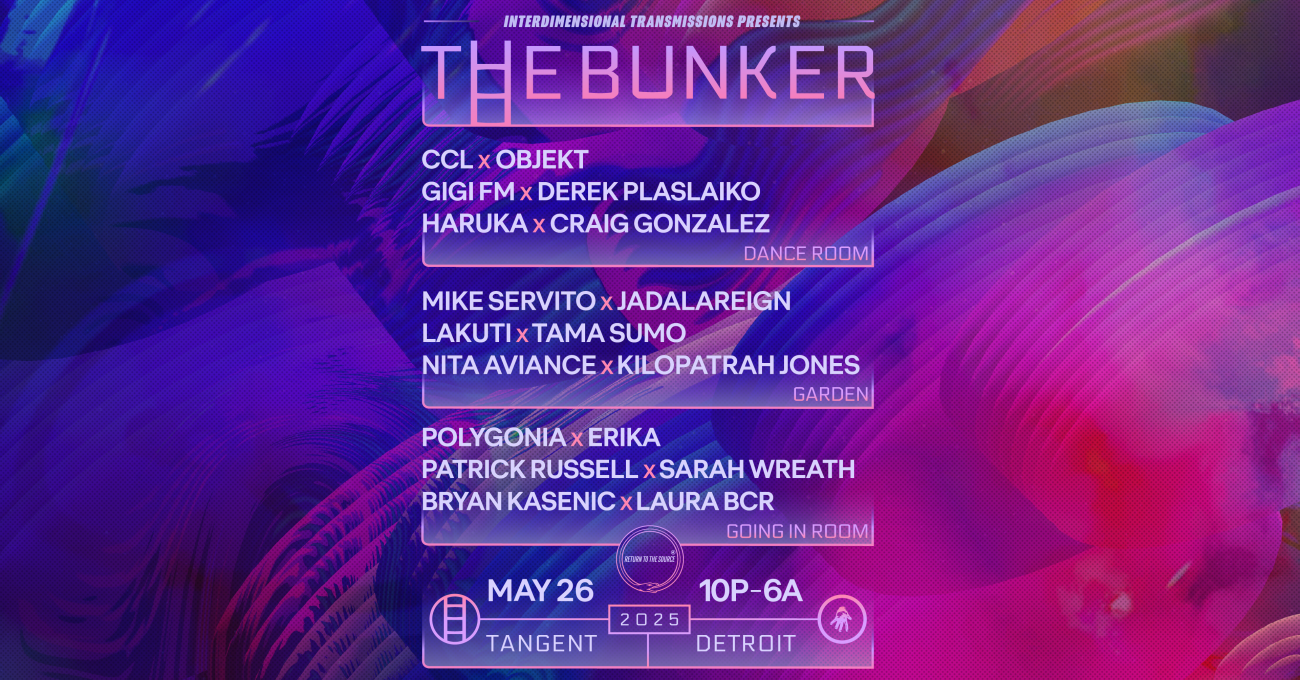 In 2016, The Bunker and Interdimensional Transmissions started a new tradition of throwing The Bunker on Memorial Day at Tangent Gallery. This is a long standing collaborative team, with The Bunker and I.T. co-producing 24 (!!!) editions of No Way Back in Detroit and Brooklyn together since 2010. The Bunker is an ongoing night of musical exploration, constantly evolving since it started in the tiny basement of (sub)Tonic in January of 2003, growing into an international music institution. The Bunker will once again be the last 8 of 32 hours of continuous music that starts with No Way Back at Return to the Source at Tangent Gallery. We’re embracing the concept of collaboration by featuring a series of specially curated DJ pairings for this Monday night wind down.